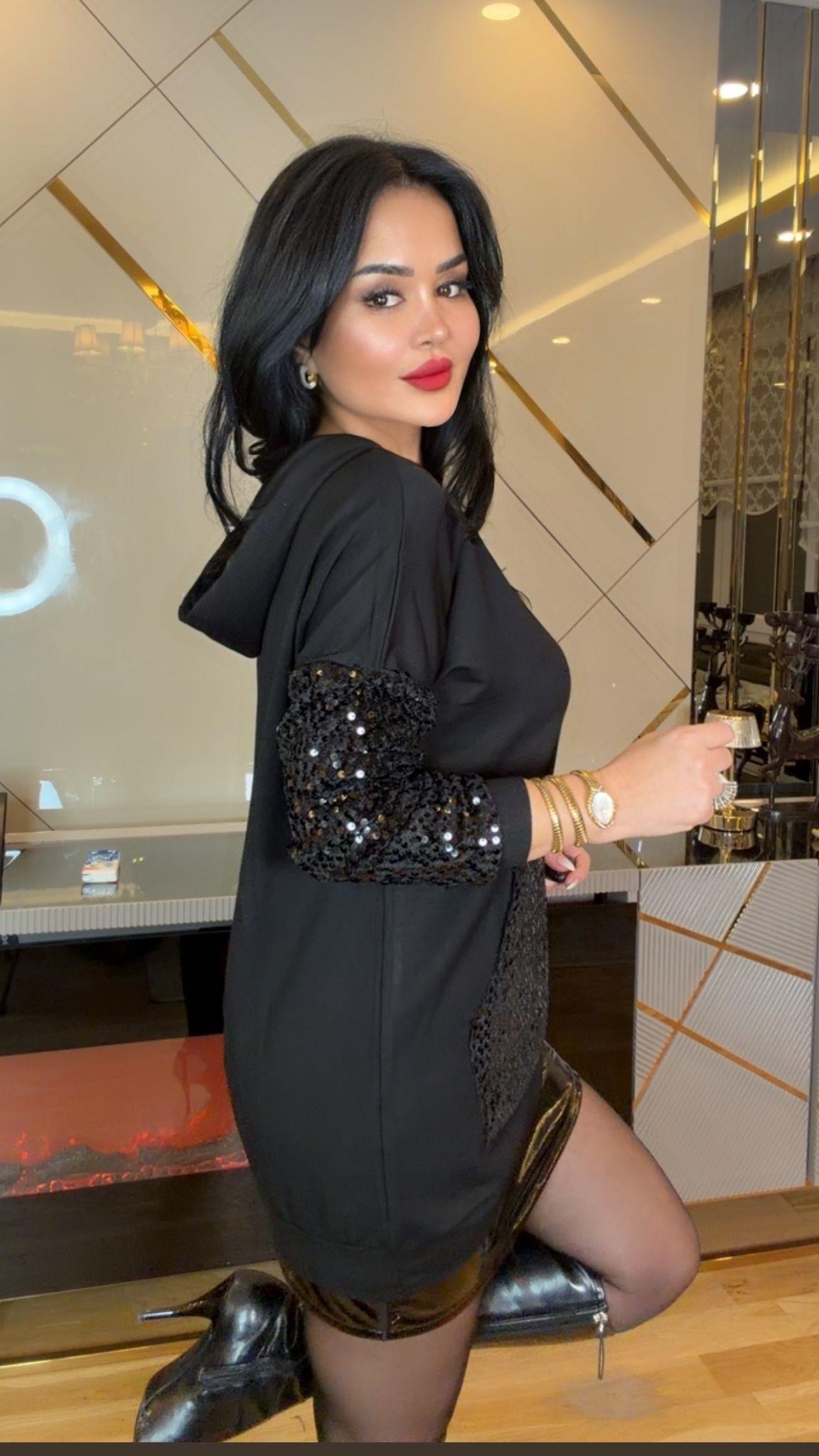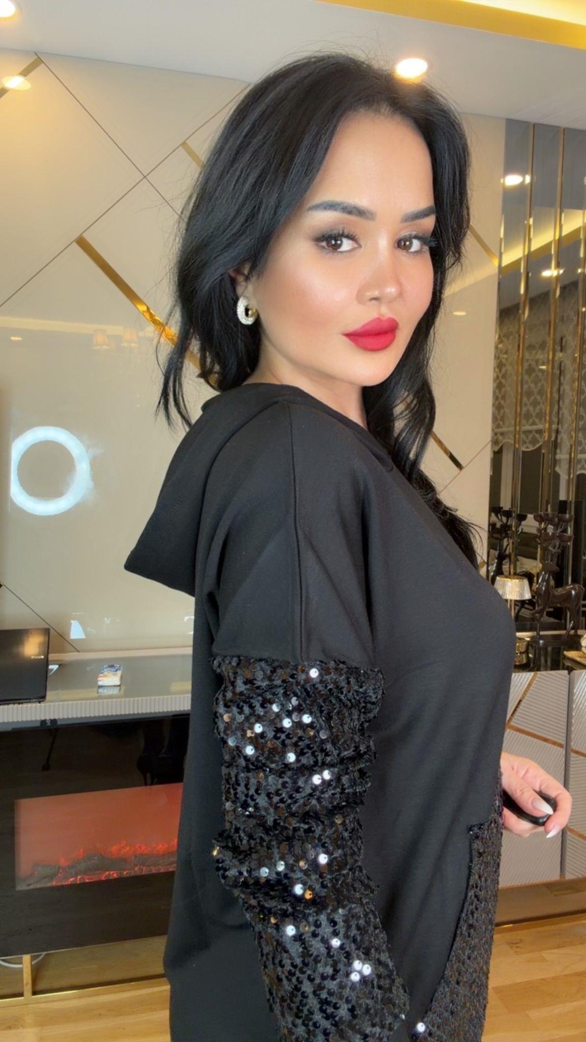 Premium kalite pamuklu iki iplik kumaştır. Kanguru cep detaylıdır. Kol ve kanguru cebi payetlidir. Tam kalıp esnekliği fazladır. Solma ve pamuklanma yapmaz.