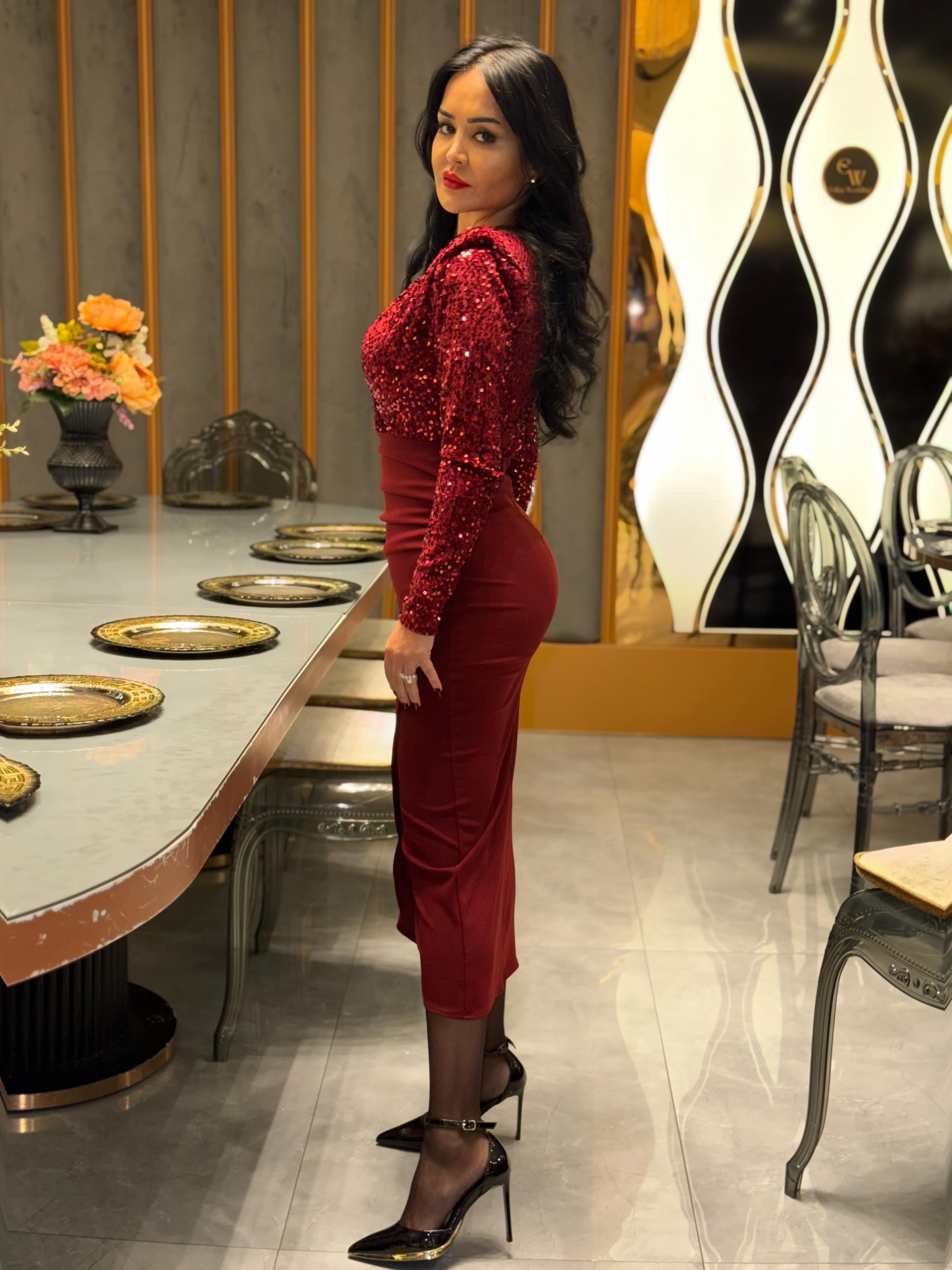 Üst Kadife kumaş üzerine payet işlemeli, alt double Krep kumaştır.