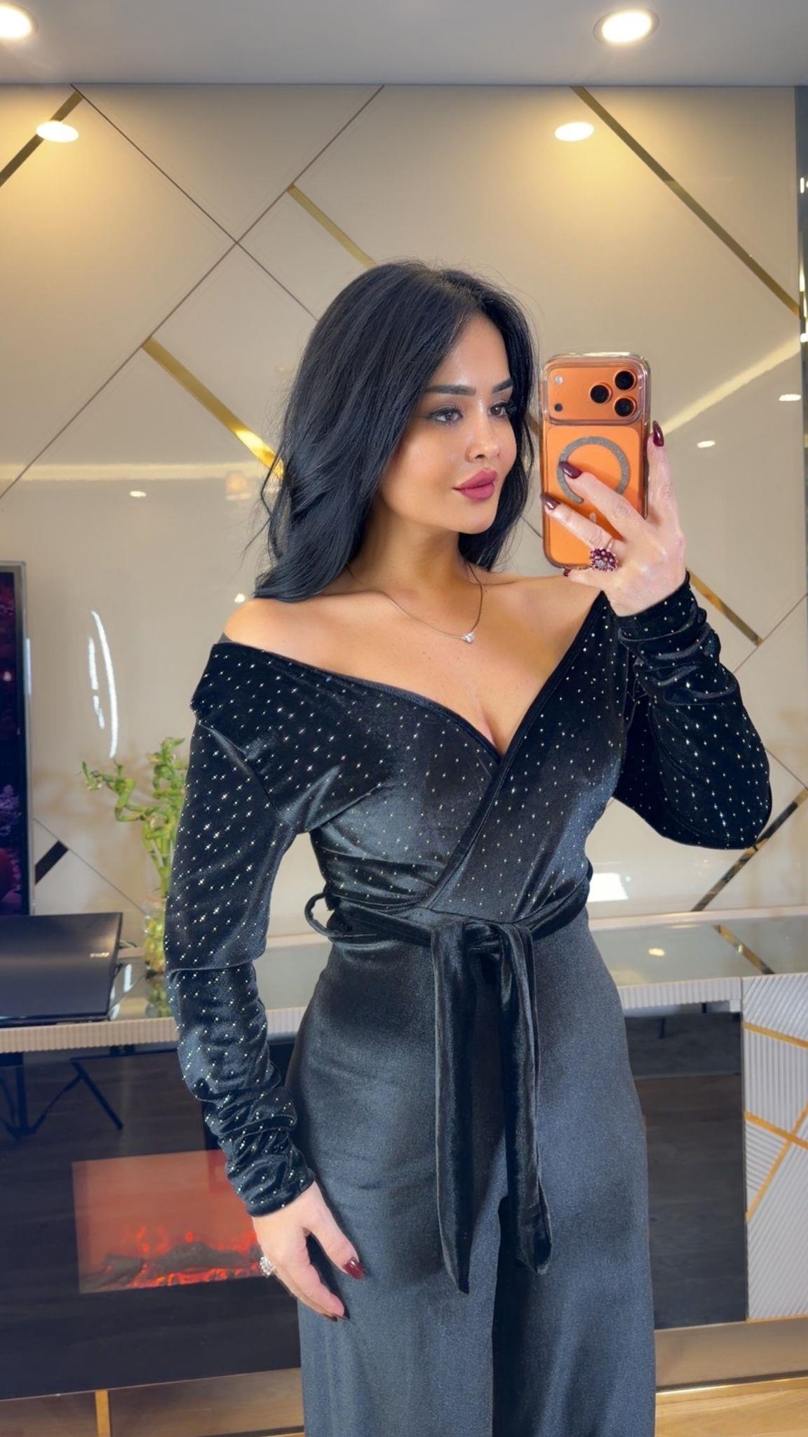 Zarafeti ve ışıltıyı bir arada sunan bu özel tasarım tulum, yumuşak dokulu kadife kumaşı sayesinde hem şık hem de konforlu bir kullanım sağlar. Gövde kısmındaki premium kalite taş işlemeleri, elbiseye göz alıcı bir parlaklık katarak özel davetlerde kusursuz bir görünüm oluşturur. Tam kalıp ve esnek yapısı sayesinde vücuda mükemmel şekilde oturur, rahat hareket imkânı sunar. Ürüne dahil olan şık kemer, beli vurgulayarak silueti daha zarif ve orantılı hale getirir.