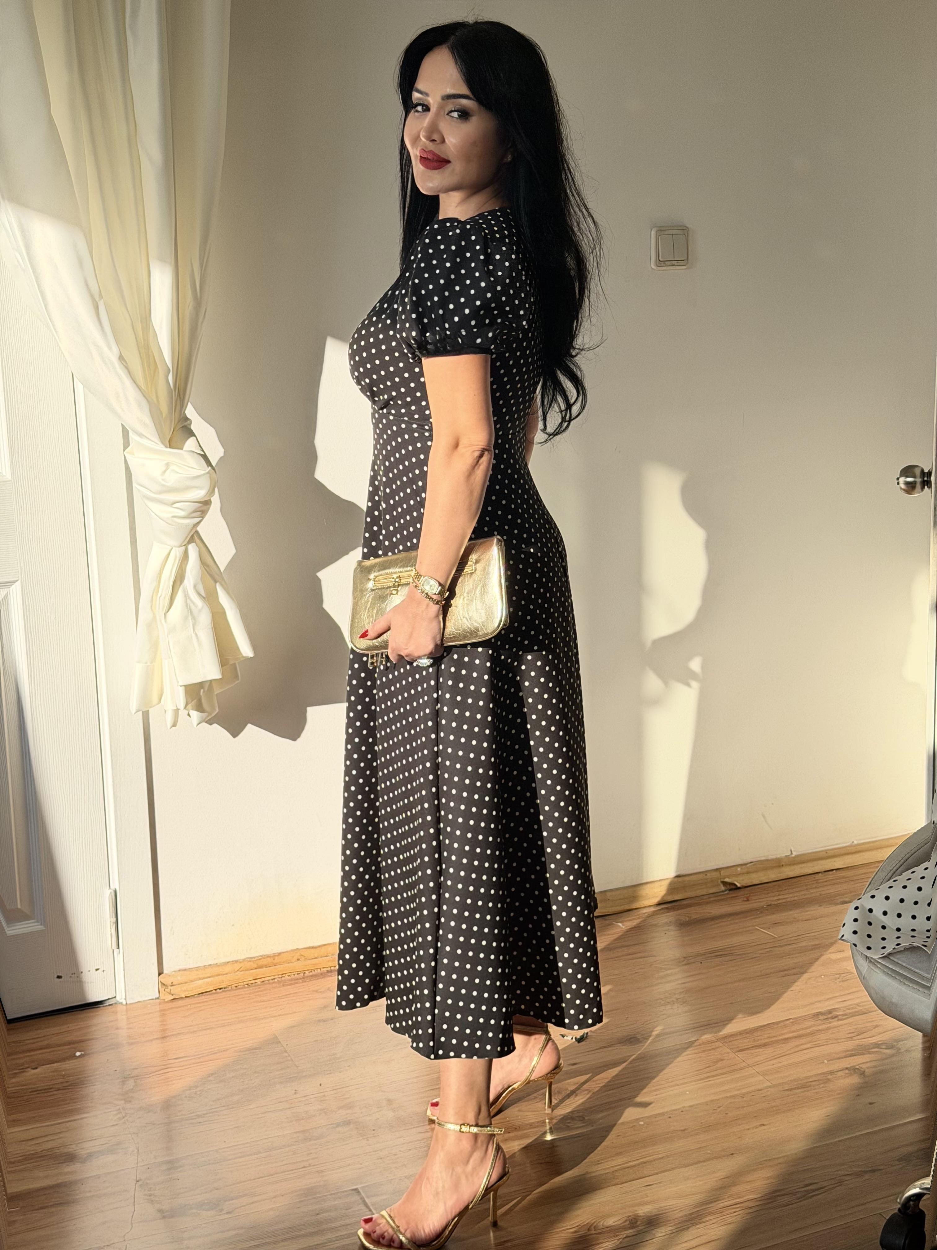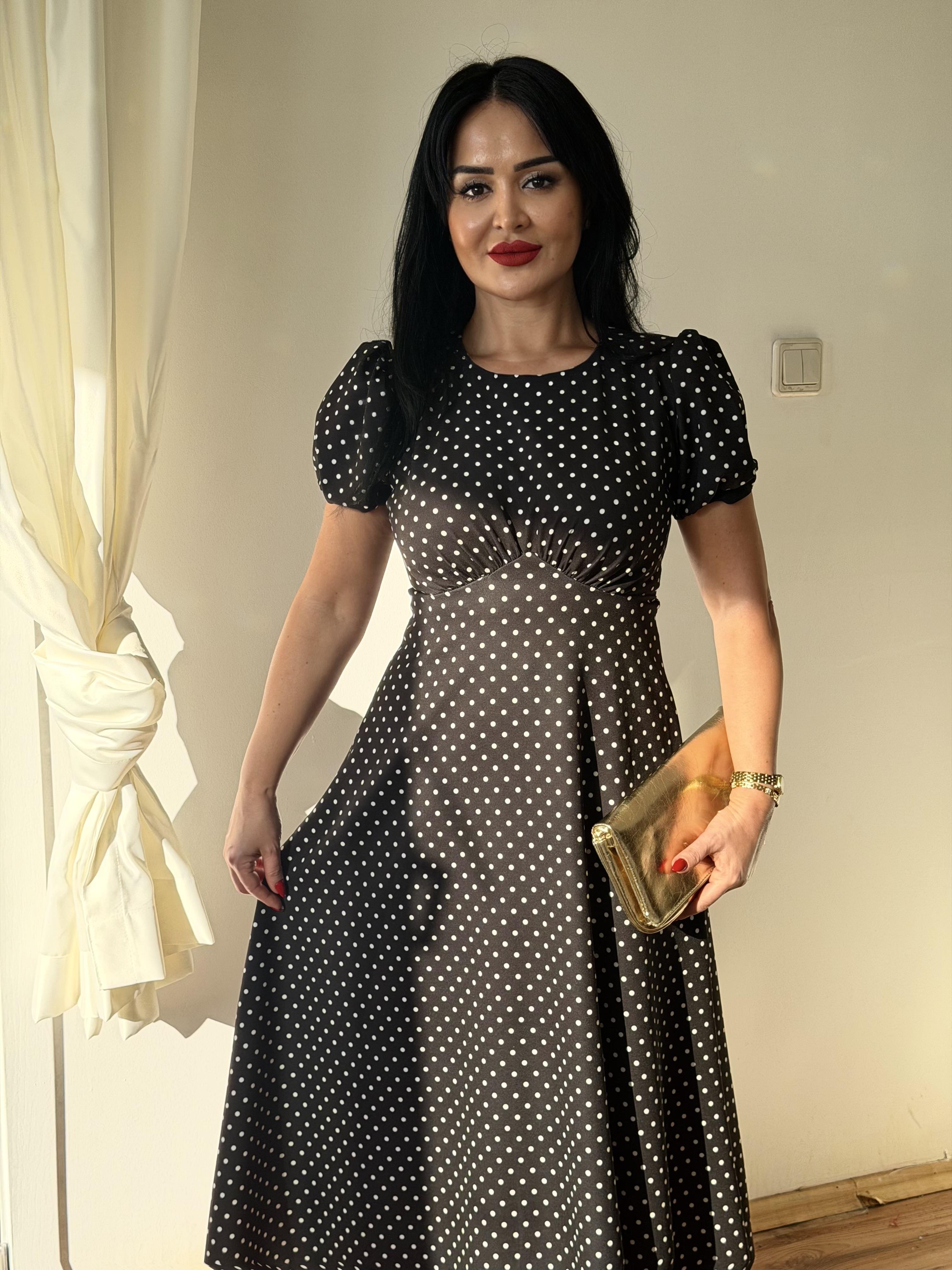 Premium kalite şıklığı ve rahatlığı bir arada sunan puantiyeli kadın elbise modeli, zarif tasarımıyla günlük kombinlerden özel davetlere kadar birçok farklı ortamda tercih edilebilir.Likralı iç göstermez leila kumaş gizli fermuarlı sayesinde tok bir duruş sağlar ve gün boyu konforlu kullanım sunar.Modern kesimi ve şık puantiye deseni ile gardırobunuzun vazgeçilmez parçalarından biri olmaya adaydır.